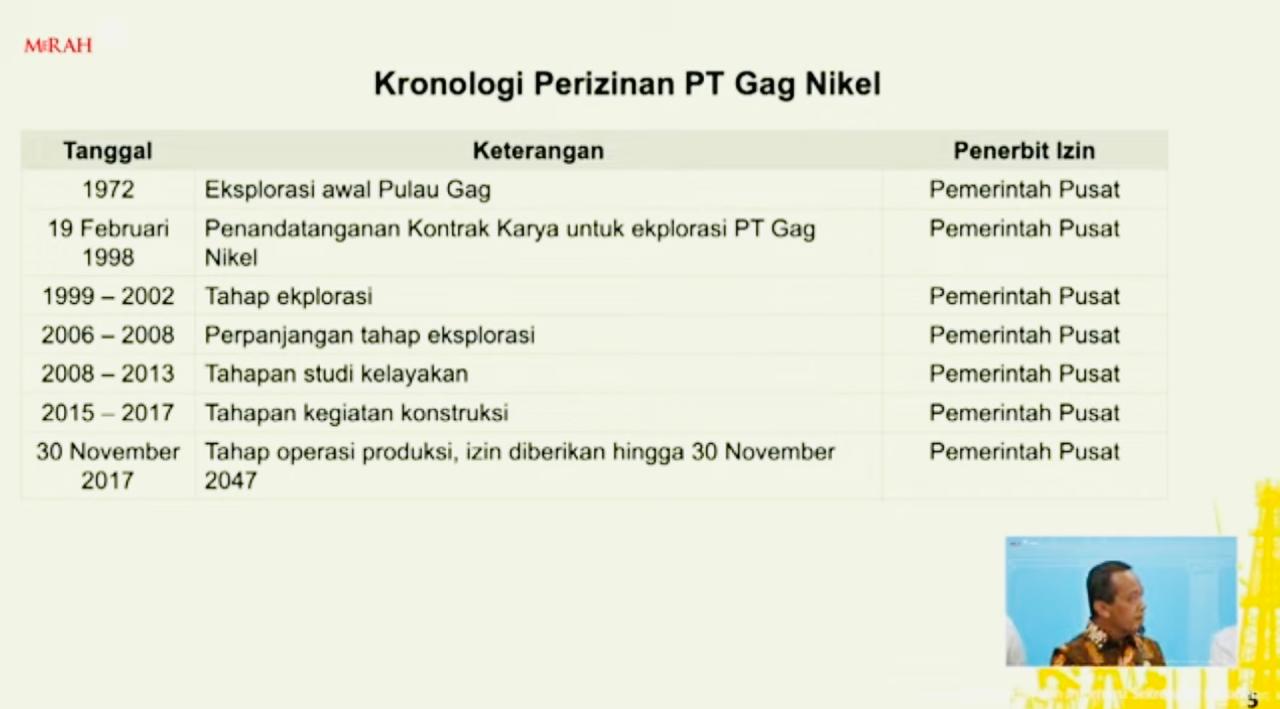 Menteri ESDM Bahlil Lahadalia sebelumnya menjelaskan bahwa tambang nikel di Pulau Gag dikelola oleh PT Gag Nikel merupakan bagian kontrak karya yang diberikan kepada investor asing pada 19 Februari 1998. Namun setelah itu, tambang diambil alih negara dan pengelolaannya diserahkan ke Antam.