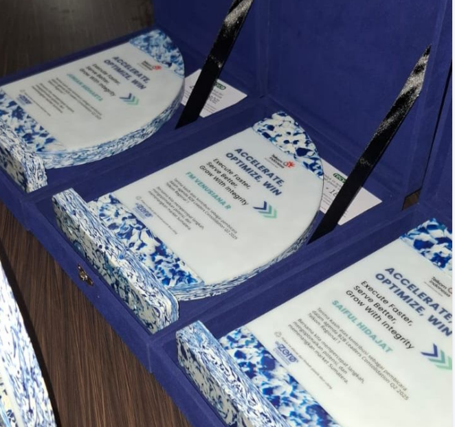 Dalam pelaksanaan acara internal bertajuk ‘B2B Leaders Consolidation’, yang berlangsung di Balai Merah Putih, Pematang Siantar, pada Jumat (23/05), Telkom Regional 1 menunjukkan bentuk nyata dari komitmen tersebut dengan menggandeng UMKM lokal Recyclo, yang berfokus pada produksi barang berbahan dasar daur ulang plastik. Bersama Recyclo, Telkom menghadirkan plakat dan souvenir ramah lingkungan sebagai bentuk apresiasi kepada para narasumber yang hadir dalam kegiatan tersebut.