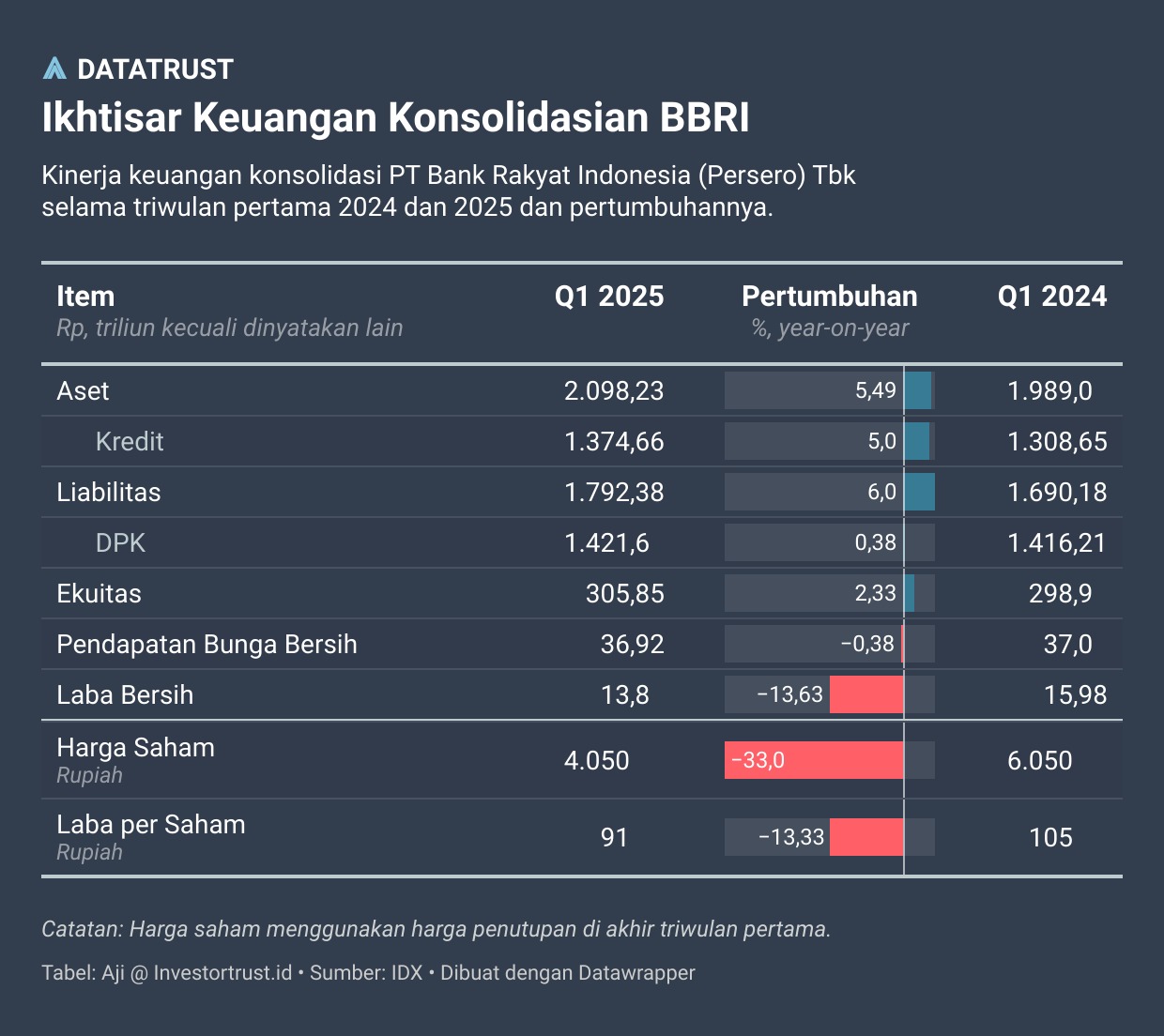 Sekadar informasi, hingga kuartal I 2025, BRI mencatatkan DPK sebesar Rp 1.421,6 triliun. Jumlah tersebut dikontribusi oleh CASA mencapai Rp 934,95 triliun yang tumbuh 7,06% secara year on year (yoy).