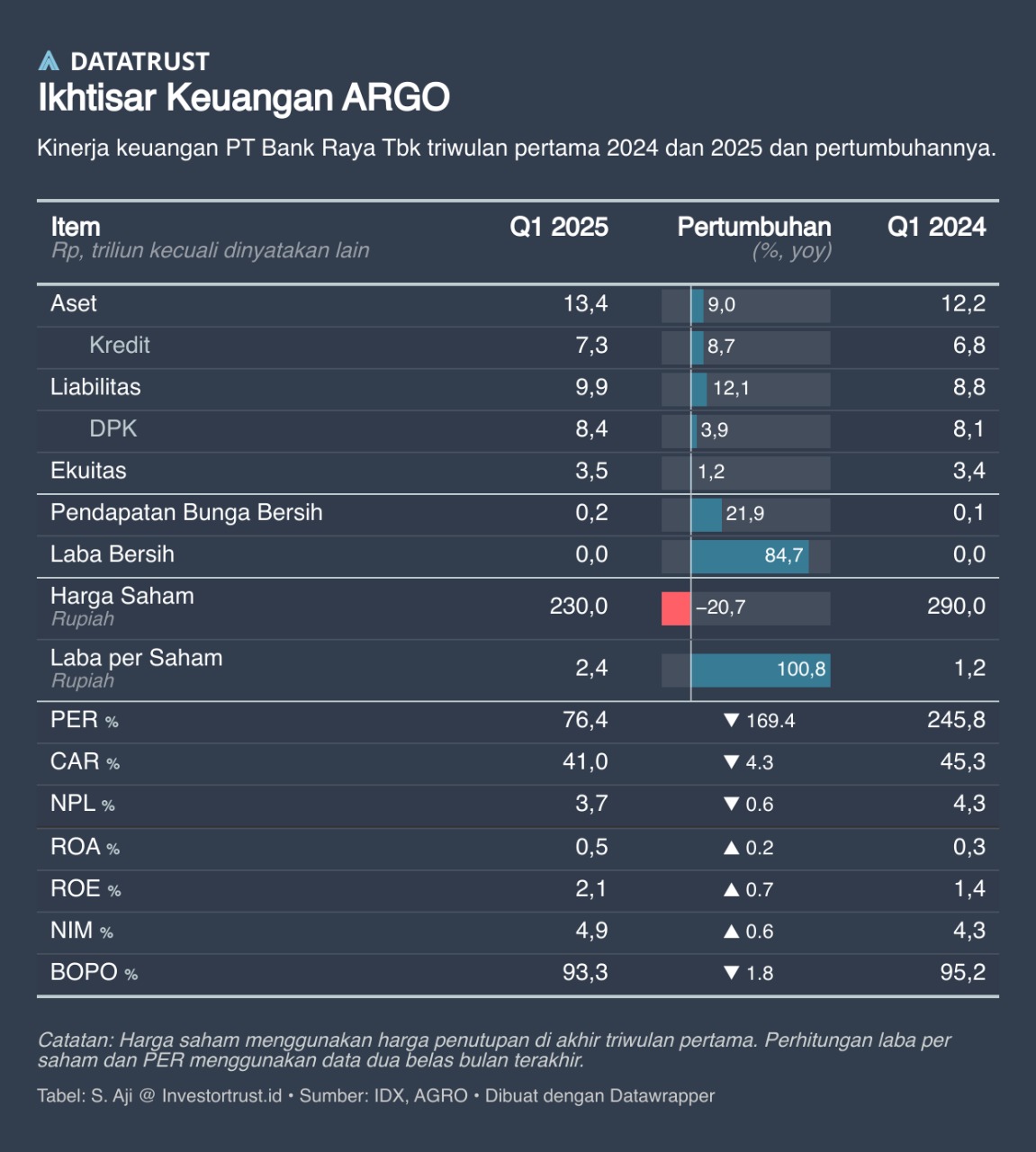 Buyback ini juga tidak berdiri sendiri, tetapi didukung oleh kinerja keuangan Bank Raya yang terus menunjukkan tren positif. Pada kuartal I-2025, perseroan mencatatkan laba bersih sebesar Rp 16,92 miliar, melonjak 84,7% dibanding periode sama tahun sebelumnya.