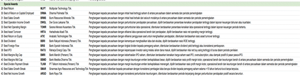 The Best Investortrust Companies 2025 juga memberikan penghargaan khusus atau special awards kepada sejumlah emiten, PT Multipolar Technology Tbk (MLPL), PT Dharma Polimetal Tbk (DRMA), PT BumI Resources Mienerals Tbk (BRMS), PT Dwi Guna Laksana Tbk (DWGL), PT Hartadinata Abadi Tbk (HRTA), PT Anabatic Technologies Tbk (ATIC), PT Bank Rakyat Indonesia Tbk (BBRI), PT Bank Syariah Indonesia Tbk (BRIS), PT Raharja Energi Cepu Tbk (RATU), PT Bank Mandiri Tbk (BMRI), PT Bank Mestika Dharma Tbk (BBMD), dan PT Telkom Indonesia (Persero) Tbk (TLKM), dan PT Bank Raya Indonesia Tbk (AGRO).