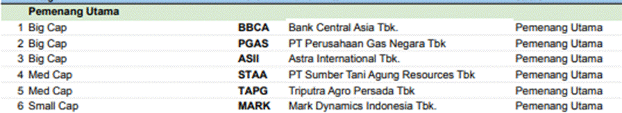 Enam emiten The Best Six Investortrust Companies 2025terdiri atas PT Bank Central Asia Tbk (BBCA),PT Astra International Tbk (ASII), dan PT Perusahaan Gas Negara Tbk (PGAS) terpilih sebagai pemenang utama untuk emiten berdasarkan kategori big cap saham. Sedangkan PT Sumber Tani Agung Resources Tbk (STAA) dan PT Triputra Agro Persada Tbk (TAPG) sebagai pemenang utama untuk kategori medium cap dan PT Mark Dynamics Indonesia Tbk (MARK) sebagai pemenang utama untuk kategori small cap.