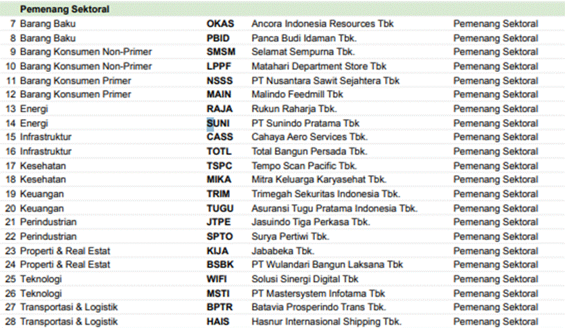 Kemudian, PT Trimegah Sekuritas Indonesia Tbk (TRIM) dan PT Asuransi Tugu Pratama Indonesia Tbk (TUGU) untuk Keuangan. PT Jasuindo Tiga Perkasa Tbk (JTPE) dan PT Surya Pertiwi Tbk (JTPE) juara Sektor Perindustrian, PT Jabebeka Tbk (KIJA) dan PT Wulandari Bangun Laksana Tbk (BSBK), PT Solusi Sinergi Digital Tbk (WIFI) dan PT Mastersystem Infotama Tbk (MSTI) untuk sektor tekonolgi, dan saham PT Batavia Prosperindo Transk Tbk (BPTR) dan PT Hasnur Internasional Shipping Tbk (HASI) peraih sektor transportasi dan logistik.