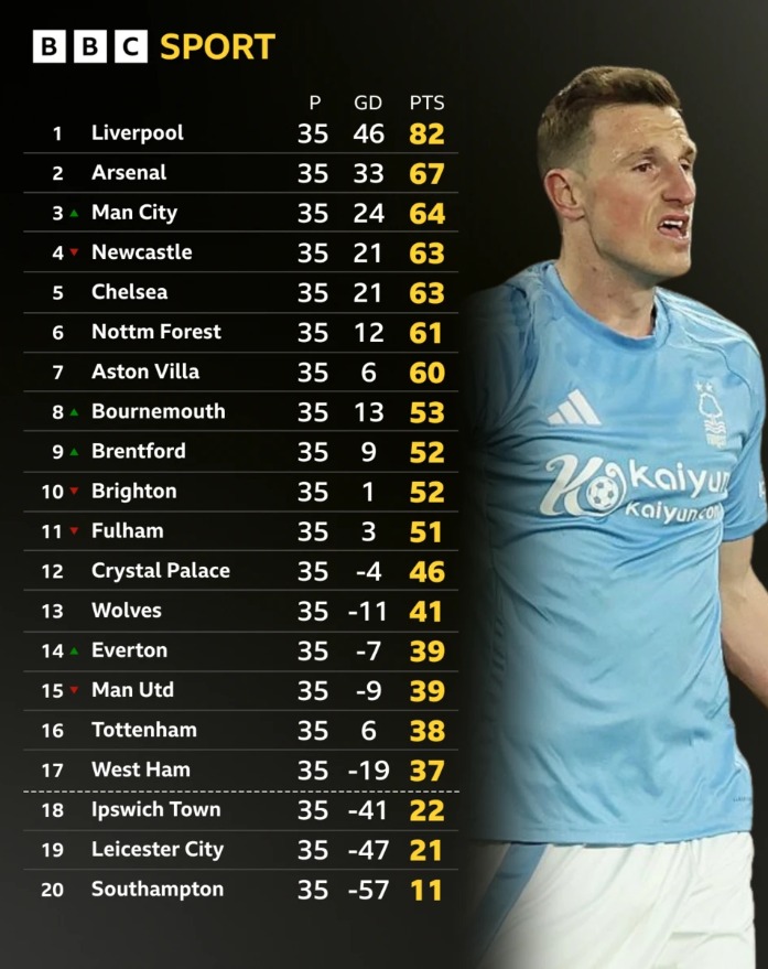 Finish lima besar tetap berada di tangan Nottingham Forest dengan pertandingan yang menguntungkan melawan Leicester City yang terdegradasi dan West Ham United yang berada di posisi ke-17. Sebab, setelah itu pertemuan yang berpotensi menentukan dengan Chelsea terjadi di City Ground pada 25 Mei 2025.