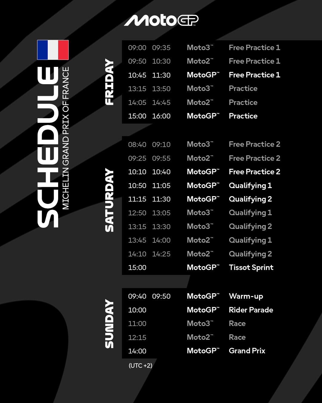 Dan, berdasarkan jadwal, MotoGP Prancis akan digelar di Le Mans pada 9-11 Mei 2025. Sesi free practice I dan practice dilangsungkan pada Jumat (9/5/2025). Kemudian free practice II, kualifikasi, dan sprint race sepanjang 13 balapan, Sabtu (10/5/2025). Sementara balapan utama berlangsung pada Minggu (11/5/2025) malam WIB.