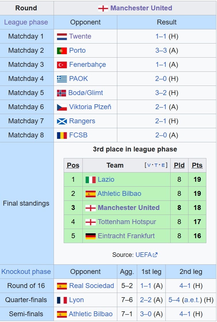 Setelah itu, Manchester United bangkit untuk menghasilkan kemenangan atas PAOK, Bodo/Glimt, Viktoria Plzen, Glasgow Rangers, dan Steaua Bucharest. Tren tanpa kekalahan berlanjut di fase knock-out saat imbang dan menang lawan Real Sociedad serta Lyon. Kemudian, mengalahkan Athletic Bilbao dua kali.