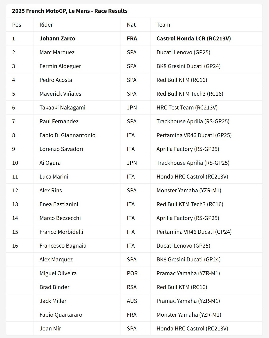 Kesempatan itu dimanfaatkan Johann Zarco untuk berjudi dengan mengambil posisi pertama di lap ketujuh. Pembalap Honda LCR itu tidak mengganti motornya. Dia terus melaju sampai putaran terakhir, Johann Zarco juara, diikuti Marc Marquez dan Fermin Aldeguer.