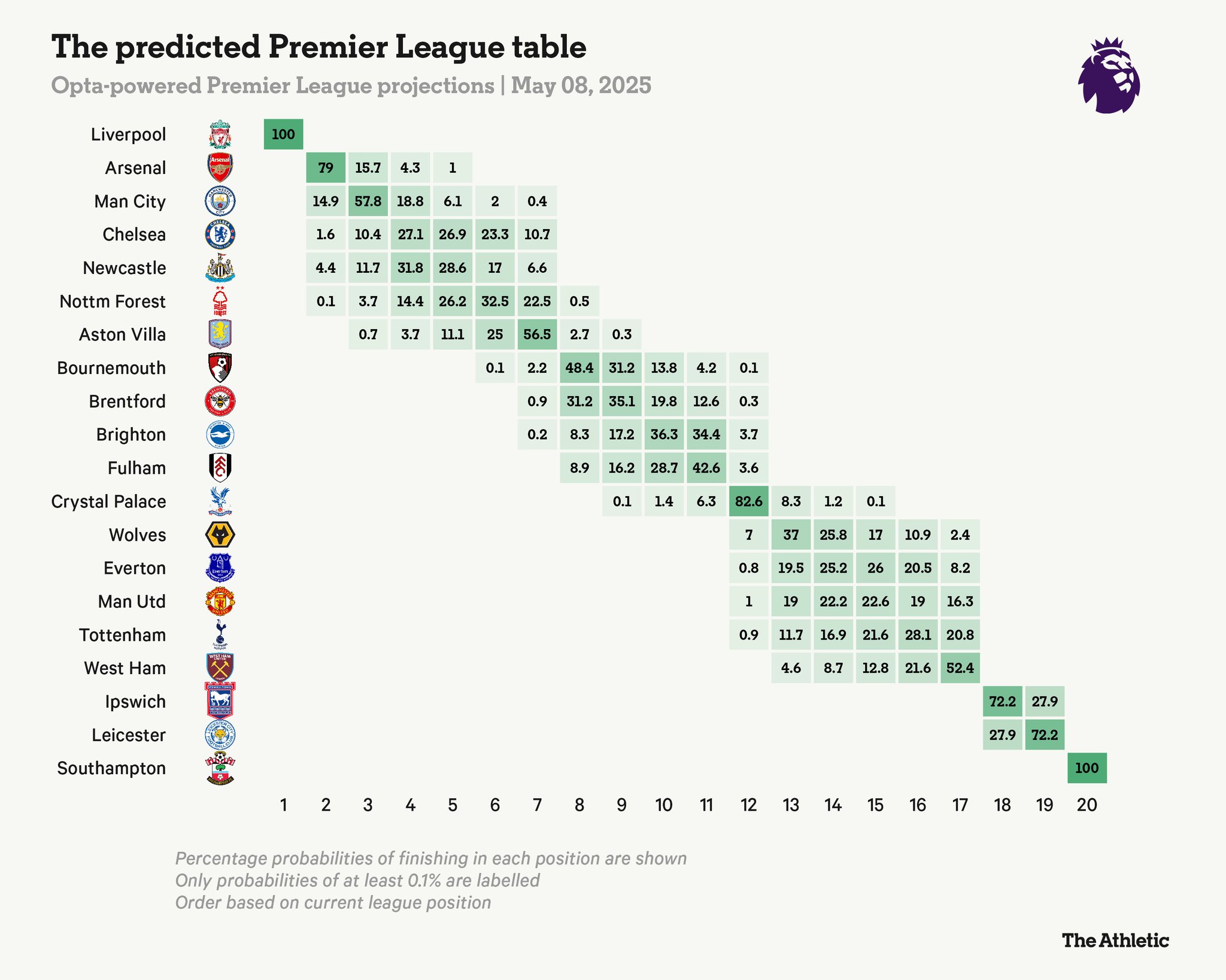 Menurut prediksi supercomputer Opta, Manchester City, Newcastle United, dan Chelsea akan lolos ke Liga Champions. Sementara Aston Villa dan Nottingham Forest diprediksi hanya akan tampil di Liga Europa dan Liga Konferensi Europa.