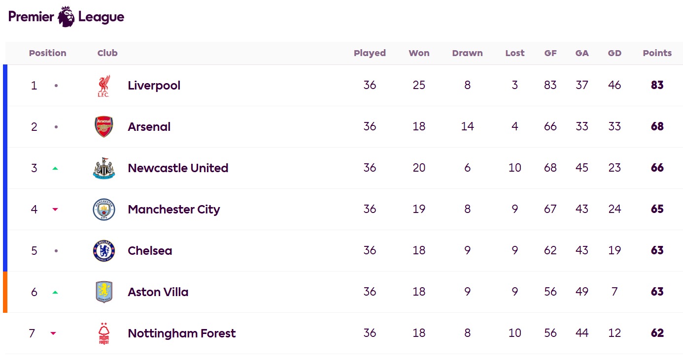 Selain Liverpool dan Arsenal yang sudah resmi lolos, Newcastle United, Manchester City, Chelsea, Aston Villa, dan Nottingham Forest juga masih memiliki peluang yang sama. Penentuannya bisa terjadi akhir pekan ini atau justru pekan depan.