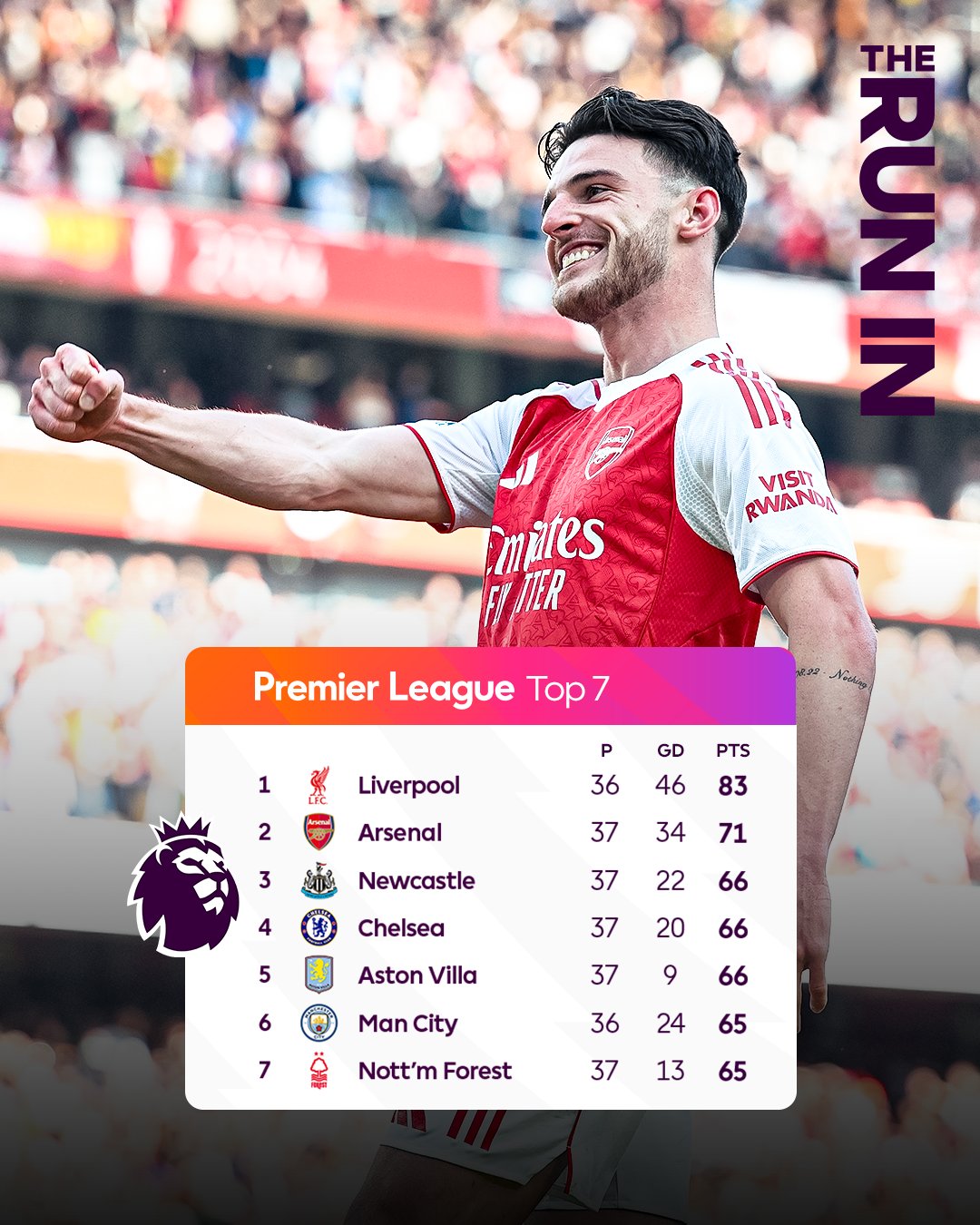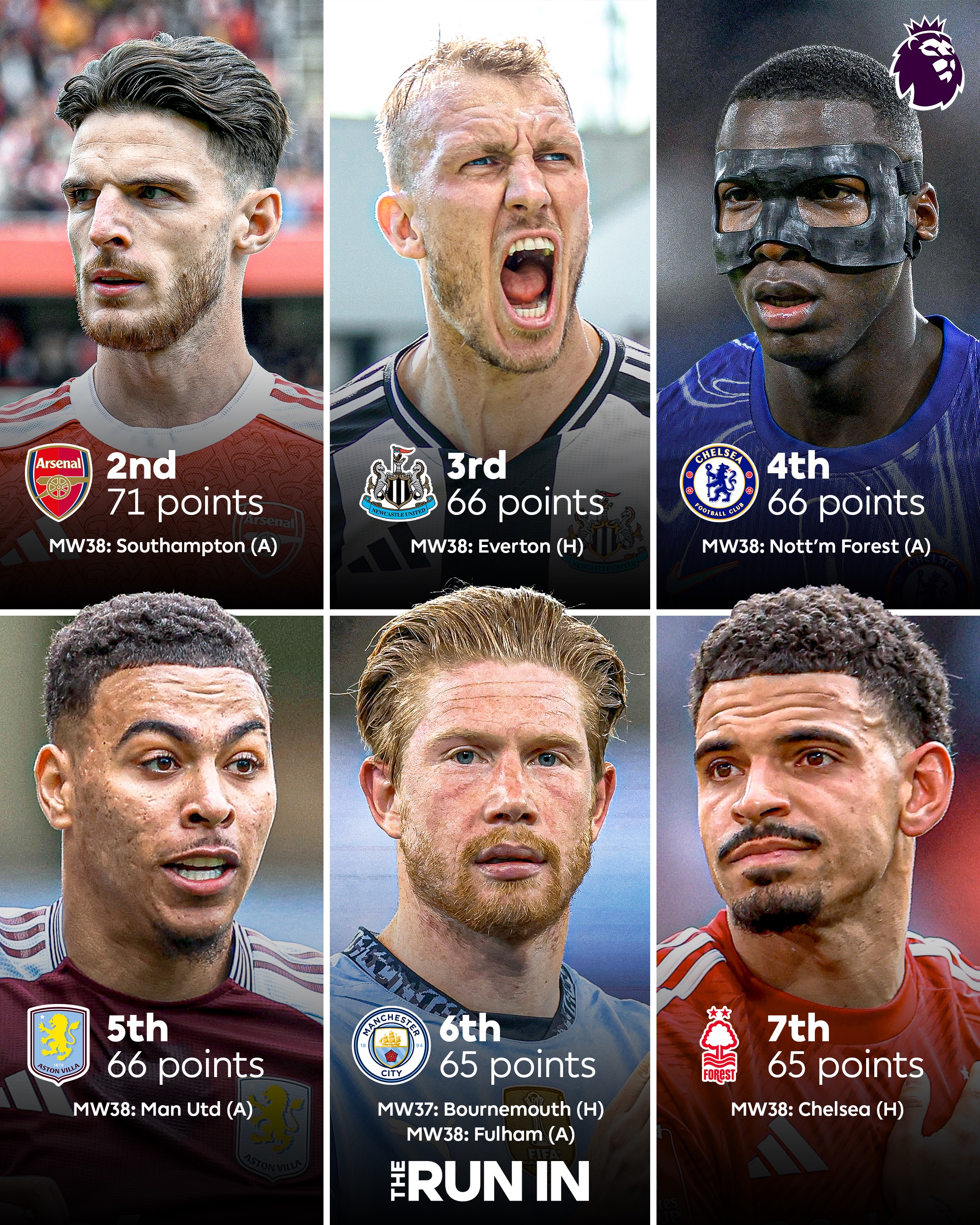 Sebaliknya, Newcastle United kini menjadi salah satu dari tiga tim dengan 66 poin, bersama Chelsea dan Aston Villa. Sementara Manchester City dan Nottingham Forest dengan 65 poin. Khusus The Citizens baru memainkan 36 pertandingan.