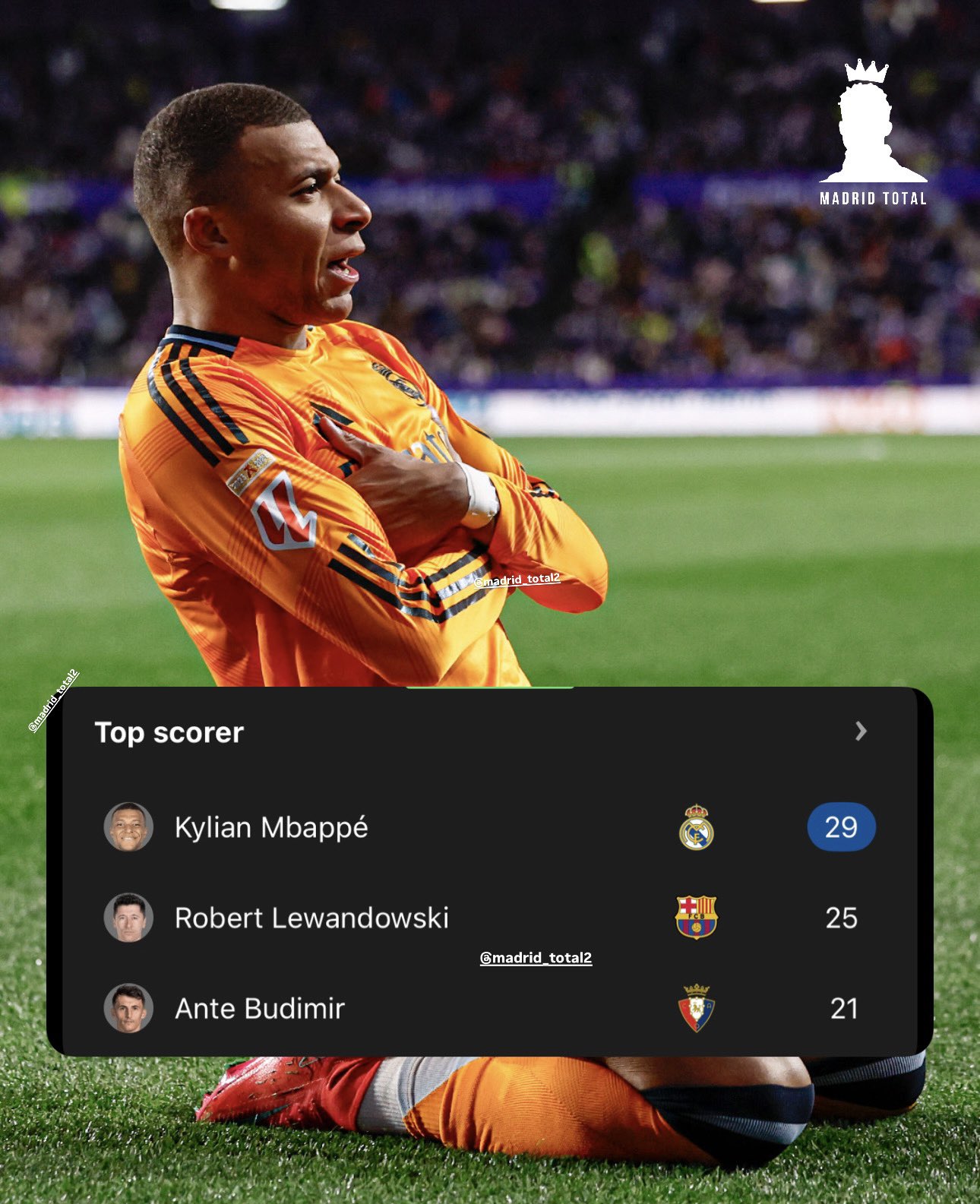 Dengan 29 gol, Kylian Mbappe masih menempati posisi teratas daftar top skor La Liga musim ini. Mantan maskot Paris Saint-Germain (PSG) itu unggul dari pesaing terdekatnya, Robert Lewandowski. Striker Barcelona itu mengoleksi 25 gol, dan sudah mengalami puasa gol dalam lima penampilan terakhir.