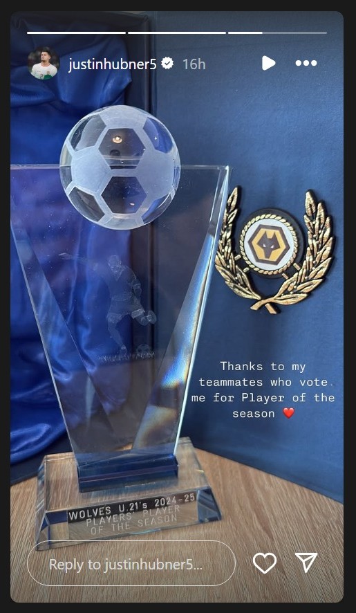 “Terima kasih teman-teman yang memilih saya menjadi Pemain Terbaik Wolves-U21,” tulis Justin Hubner di media sosial.
