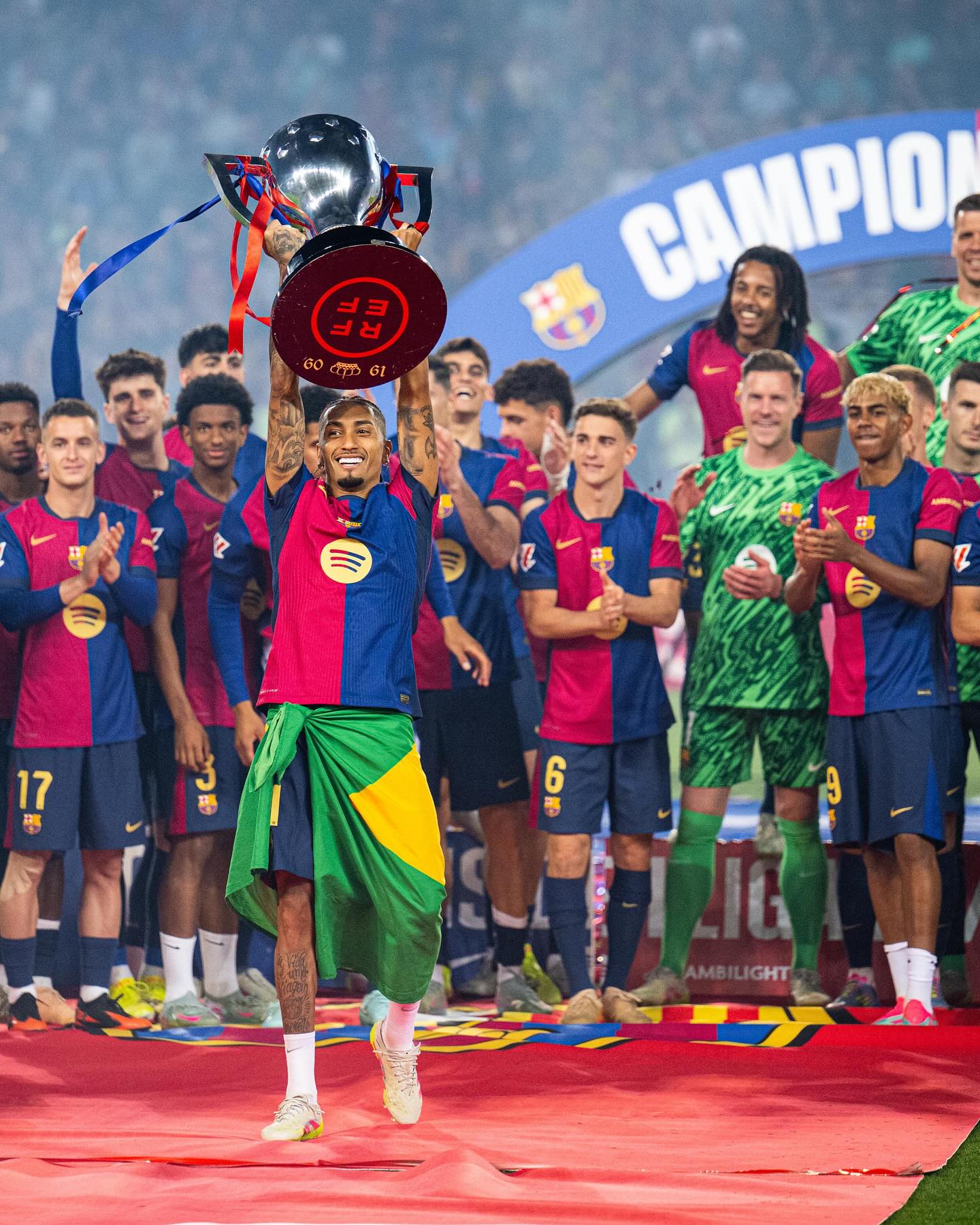 Raphinha covered the length of the Montjuic pitch on his knees after completing a trophy-filled season with Barcelona.
