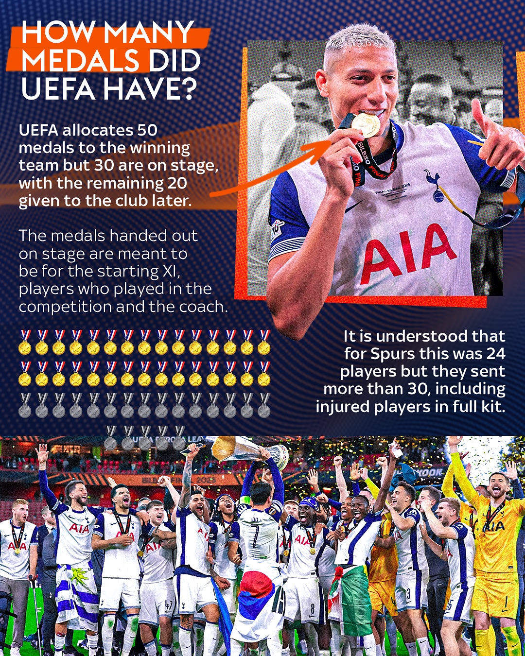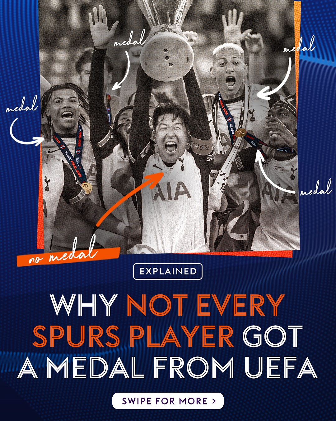 Tapi, ketika giliran pemain-pemain di baris terakhir, Aleksander Ceferin terlihat kebingungan karena staf UEFA ternyata kehabisan medali. Akibatnya, Son Heung-min yang berada di barisan paling belakang tidak mendapatkan medali. Sonny hanya diberikan trofi yang kemudian diangkat di podium bersama rekan-rekannya.