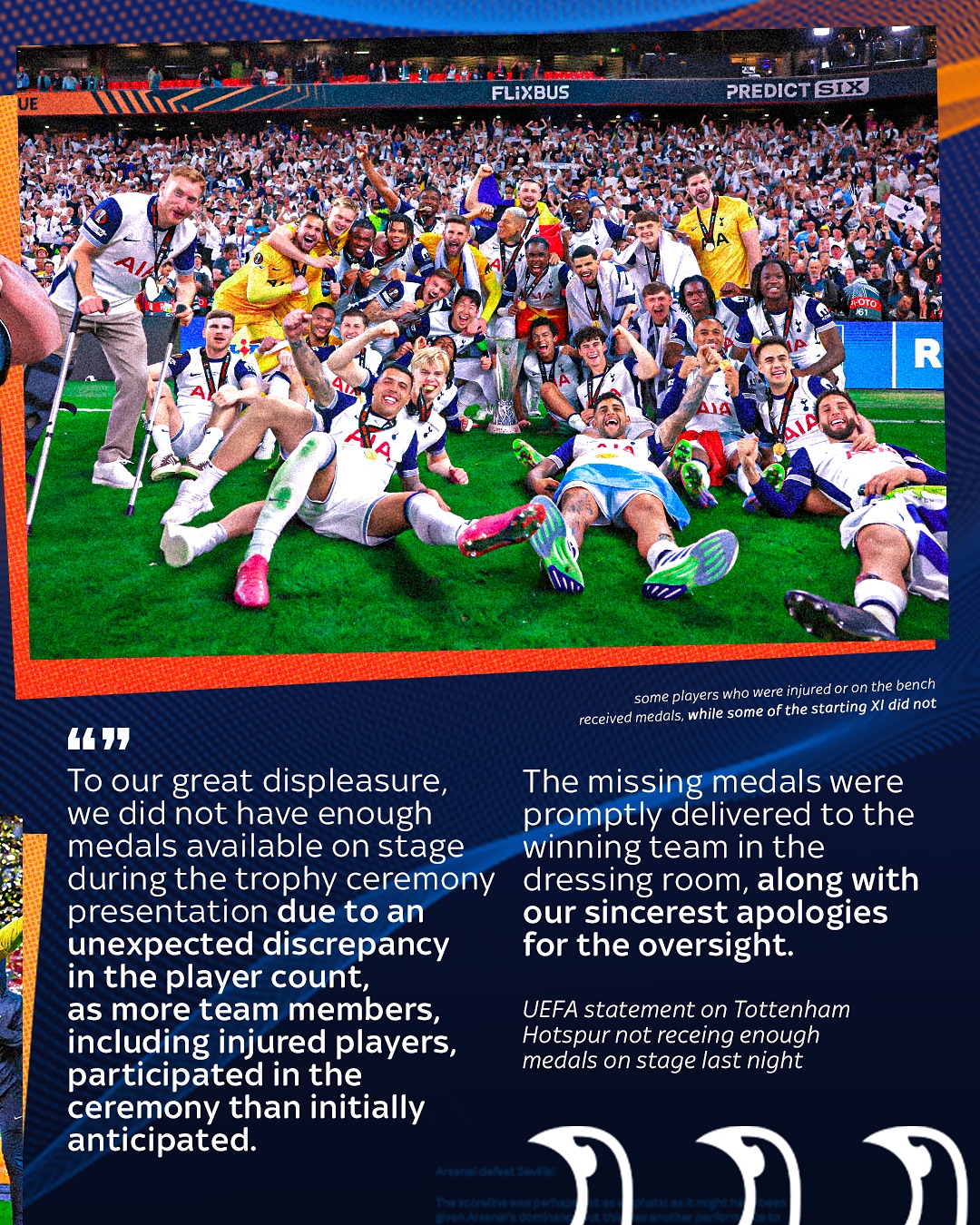 Masalahnya, selain skuad final Spurs yang beranggotakan 23 pemain plus Ange Postecoglou, beberapa anggota tim yang tidak tampil juga ikut serta dalam upacara tersebut. Akibatnya, Son Heung-min hanya mendapatkan pelukan dan penjelasan Aleksander Ceferin ketika didaulat mengangkat trofi Liga Europa.