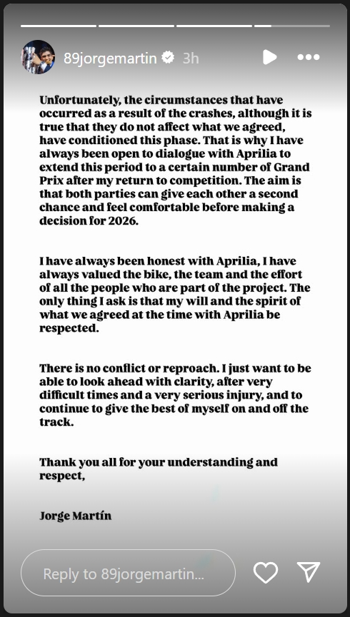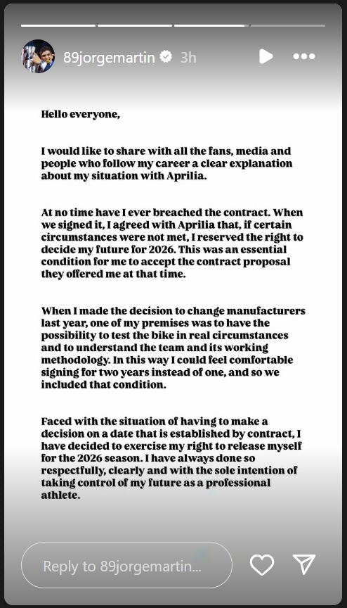 “Menghadapi situasi harus membuat keputusan pada tanggal yang ditetapkan dalam kontrak, saya telah memutuskan untuk menggunakan hak saya untuk melepaskan diri untuk musim 2026. Saya selalu melakukannya dengan penuh rasa hormat, jelas, dan dengan satu-satunya tujuan untuk mengendalikan masa depan saya sebagai atlet profesional,” ungkap Jorge Martin.