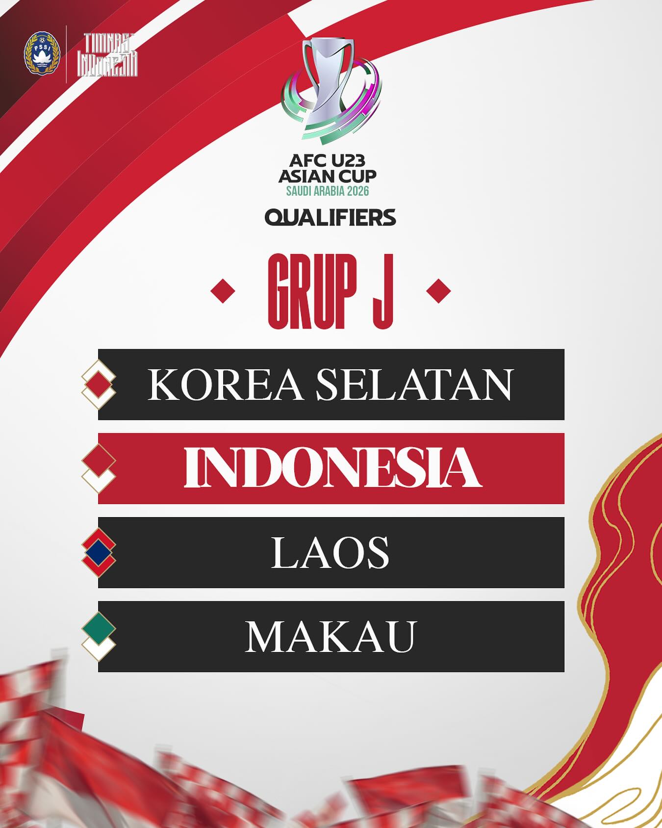 Kualifikasi Piala Asia U-23 2026 menggunakan konsep home tournament di satu negara. Dan, Indonesia dipercaya menjadi penyelenggara untuk Grup J. Timnas U-23 Indonesia akan menghadapi Korea Selatan, Laos, dan Makau.
