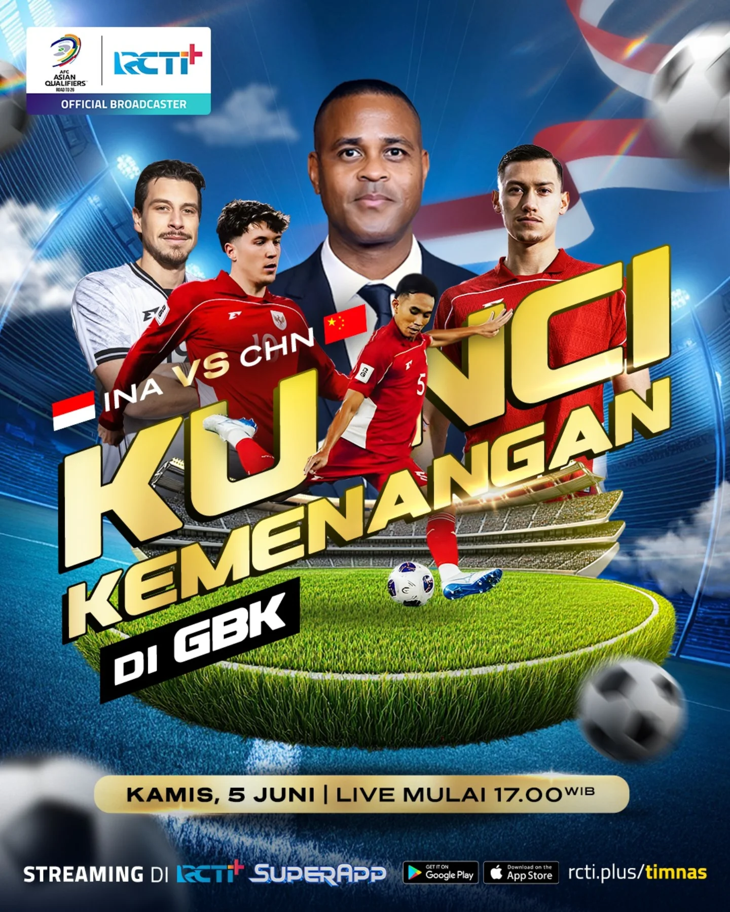 Pertandingan Timnas Indonesia lawan China akan ditayangkan langsung RCTI mulai pukul 19.30 WIB, Bisa juga melalui live streaming di RCTI plus.