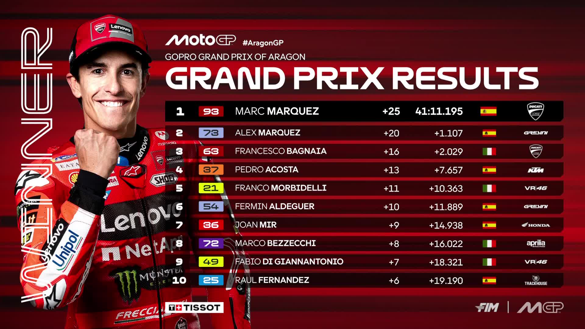 ARAGON, investortrust.id – Kakak beradik Marc Marquez dan Alex Marquez mendominasi main race MotoGP Aragon di Motor Land, Minggu (8/6/2025) malam WIB. Marc finish terdepan dengan catatan waktu 41 menit 11,195 detik, diikuti sang adik Alex.