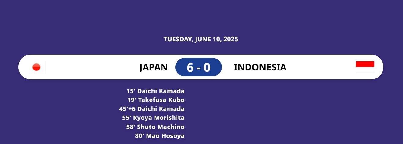 Pada paruh kedua, Jepang tidak melonggarkan serangan. Samurai Biru menambah gol melalui Ryoya Morishita (55), Shuto Machino (58), dan Mao Hosoya (80). Skor akhir 6-0 untuk kemenangan tuan rumah Jepang.