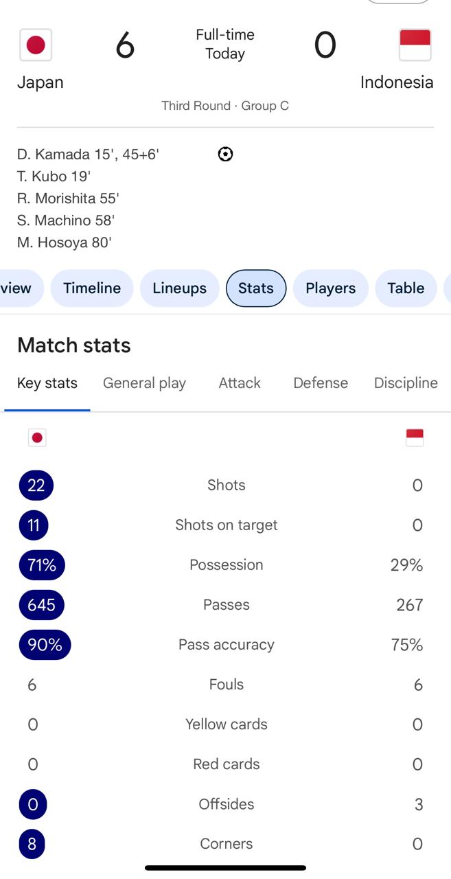 Hasil ini tidak mempengaruhi posisi di klasemen. Jepang tetap berada di puncak klasemen Grup C dengan 23 poin dari 10 pertandingan. Sementara Timnas Indonesia di posisi keempat dengan 12 poin dari 10 pertarungan.