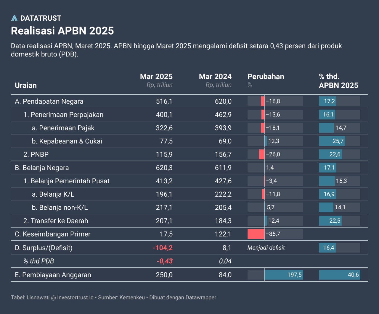 Penerimaan per Maret 2024, KND tercatat sebesar Rp 42,89 triliun. Posisi KND yang amblas -74,58% ini terjadi karena BUMN tak lagi menyetor dividen ke pemerintah.