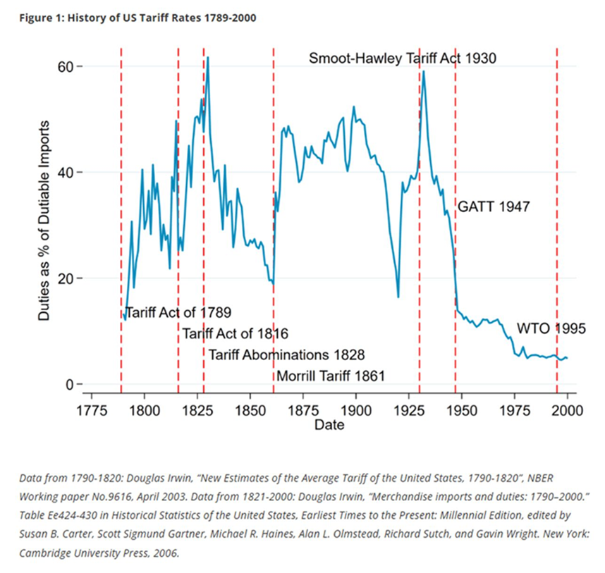 Sejak deklarasi kemerdekaan, AS terlibat perang kemerdekaan melawan Inggris tahun 1775-1783. Pemilu pertama AS kemudian dilaksanakan pada 1788/1789. Menteri Keuangan AS yang pertama, Alexander Hamilton, kemudian memutuskan untuk menaikkan tarif impor pada tahun 1790, untuk memperkuat pembangunan industri AS.
