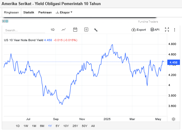 JAKARTA, investortrust.id - US Treasury tenor 10 tahun sempat mengalami kenaikan saat “gencatan perang tarif” Amerika Serikat dan China, Selasa (13/5/2025). Dalam pantauan di laman Bloomberg, imbal hasil US Treasury 10 tahun sempat menyentuh 4,475%.