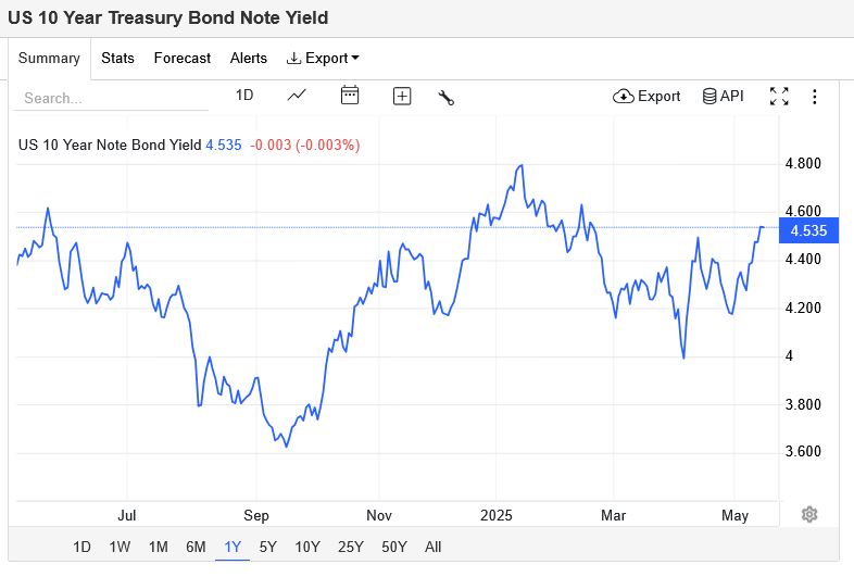 Yield Treasury tenor 10 tahun naik 3,7 basis poin menjadi 4,536%, sementara tenor 2 tahun meningkat 4,2 basis poin ke level 4,059%. Kenaikan tersebut terjadi sehari setelah laporan inflasi konsumen (CPI/consumer price index) untuk April menunjukkan angka yang lebih jinak dibanding perkiraan, menurunkan tekanan terhadap ekspektasi suku bunga jangka pendek.