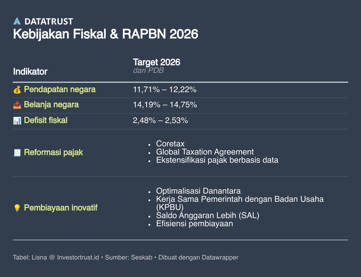 Sasaran fiskal pada 2026 dirancang. Kedaulatan pangan, energi, dan ekonomi jadi target utama. Strategi menengah, pemerintah fokus terhadap delapan strategi utama, antara lain, ketahanan pangan, ketahanan energi, Makan Bergizi Gratis, program pendidikan, program kesehatan, pembangunan desa melalui koperasi dan UMKM, dan pertahanan semesta, serta akselerasi investasi dan perdagangan global.