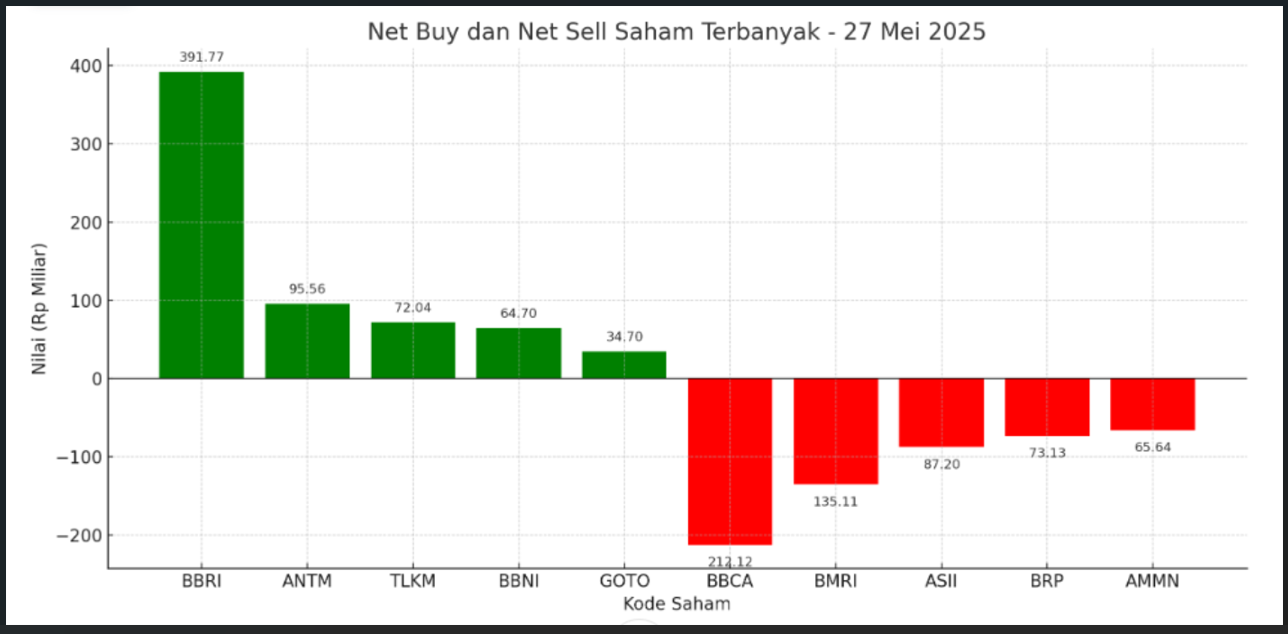 Meski pemodal asing berbalik mencatatkan net sell (penjualan bersih) saham, indeks harga saham gabungan (IHSG) Bursa Efek Indonesia pada Selasa (27/05/2025) ditutup rebound 10,62 poin (0,15%), ke 7.198,97. Investortrust mencatat, net sell terbanyak melanda saham PT Bank Central Asia Tbk (BBCA) Rp 212,12 miliar, PT Bank Mandiri Tbk (BMRI) Rp 135,11 miliar, PT Astra International Tbk (ASII) Rp 87,20 miliar, PT Barito Pacific Tbk (BRP) Rp 73,13 miliar, dan PT Amman Mineral Interasional Tbk (AMMN) Rp 65,64 miliar.