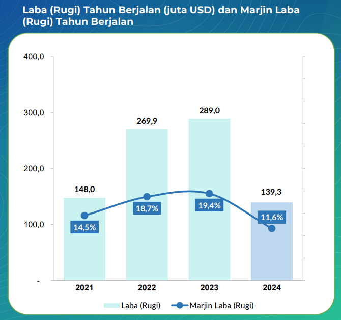 Tahun 2023, perseroan torehkan pendapatan US$ 1,49 miliar dan adjusted EBITDA senilai US$ 614,5 juta. Perseroan juga mencatatkan penurunan drastic laba bersih dari US$ 289 juta pada 2023 menjadi US$ 139,3 juta pada 2024.