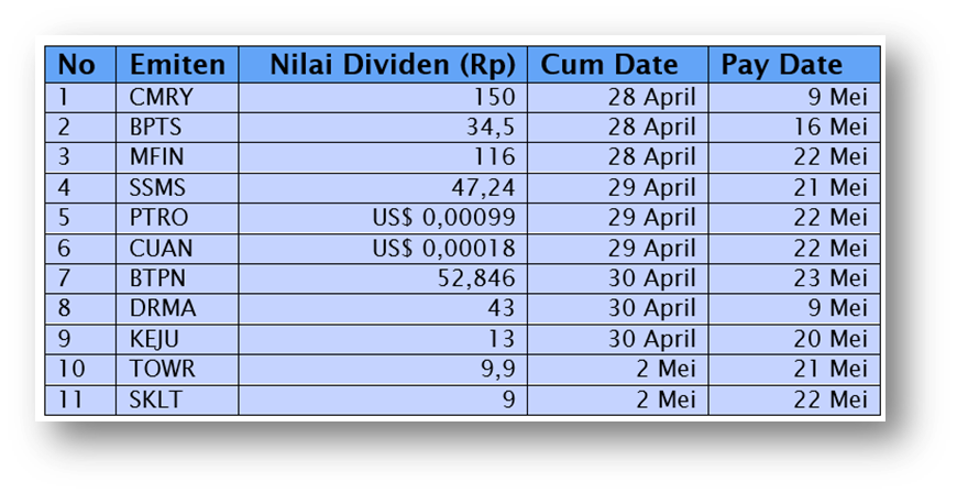 Berdasarkan data Bursa Efek Indonesia (BEI), tiga emiten akan menggelar cum dividen di pasar regular dan pasar tunai Senin (28/4/2025), yaitu PT Cisarua Mountain Dairy Tbk (CMRY) atau Cimory, PT Bank BTPN Syariah Tbk (BTPS), dan PT Mandala Multifinance Tbk (MFIN). Hari berikutnya, Selasa (29/4/2025), tiga emiten kembali menggelar cum dividen PT Sawit Sumbermas Sarana Tbk (SSMS), PT Petrosea Tbk (PTRO), dan PT Petrindo Jaya Kreasi Tbk (PTRO).
