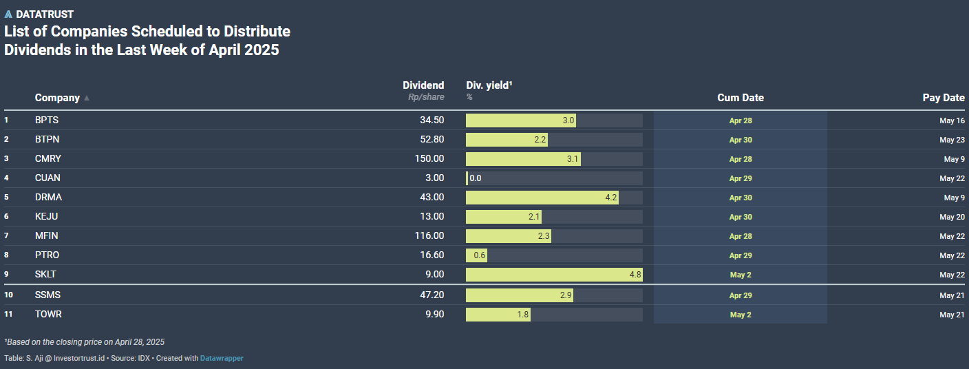 “Dengan yield dividen berdasarkan penutupan 28 April 2025, TAPG tercatat menawarkan 12,1%, SCMA 8,8%, AKRA 8,3%, PRDA 6,2%, dan ELPI 3,6%, memberikan daya tarik tambahan di tengah situasi pasar yang menantang,” ujar Hendra kepada investortrust.id Selasa, (29/4/2025).