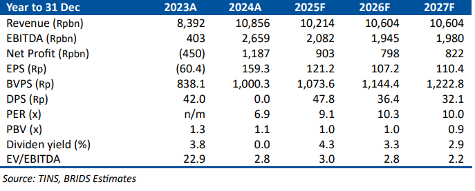 BRI Danareksa Sekuritas dalam riset yang dipublikasikan hari ini, Senin (5/5/2025), target harga saham TINS dipangkas dari semula Rp 2.300 menjadi Rp 1.300 dengan rekomendasi dipertahankan beli.