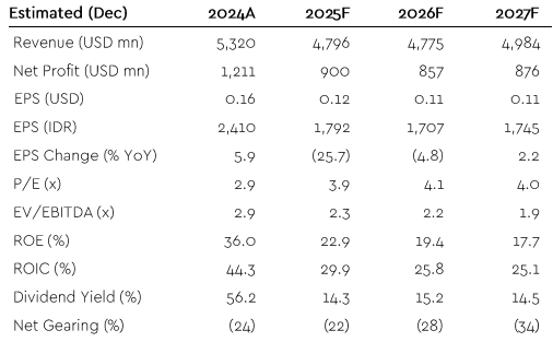 Hingga kuartal I-2025, Adaro Andalan (AADI) berhasil mencatatkan laba periode berjalan sebanyak US$ 222,88 juta. Angka ini turun dari periode sama tahun sebelumnya US$ 311,56 juta. Penurunan tersebut sejalan dengan pelemahan pendapatan usaha dari US$ 1,31 miliar menjadi US$ 1,16 miliar akibat penurunan rata-rata harga jual batu bara global.