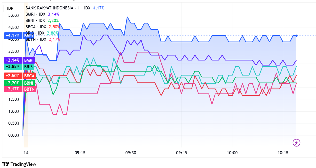 JAKARTA, investortrust.id – Saham bank dibuka melesat pada perdagangan intraday sesi I Bursa Efek Indonesia (BEI), Rabu (14/5/2025), dipimpin saham PT Bank Rakyat Indonesia Tbk (BBRI). Kenaikan saham bank tersebut berkontribusi terhadap kenaikan indeks harga saham gabungan (IHSG) lebih dari 100 poin menjadi 6.937 pag ini.