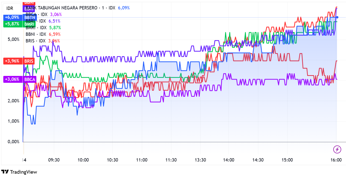 Lompatan indeks tersebut ditopang penguatan pesat saham 4 bank besar, seperti BBRI, BMRI, BBCA, dan BBNI. Penguatan juga ditopang kenaikan saham emiten Prajogo Pangestu CUAN, TPIA, dan BREN, dan kenaikan saham emiten Sinarmas DSSA.