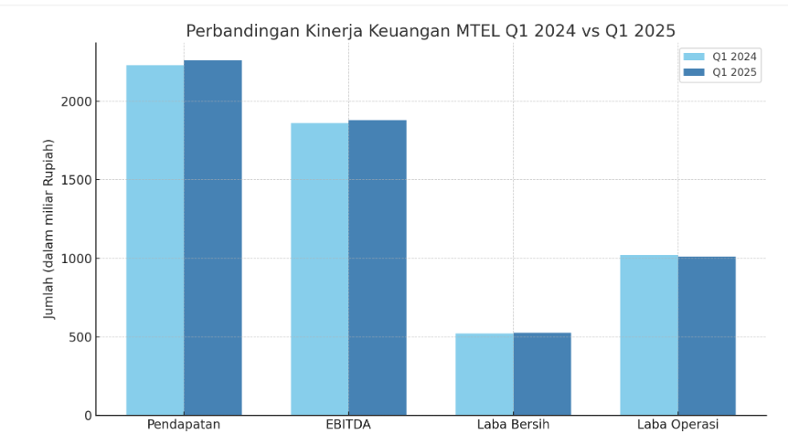 Hingga kuartal I-2025, Mitratel (MTEL) berhasil melanjutkan pertumbuhan laba tahun berjalan menjadi Rp 526,31 miliar, dibandingkan periode sama tahun sebelumnya Rp 520,98 miliar. Kenaikan tersebut menjadikan laba per saham bertahan di level Rp 6.Kenaikan laba tersebut sejalan dengan peningkatan pendapatan MTEL dari Rp 2,23 triliun menjadi Rp 2,26 triliun.