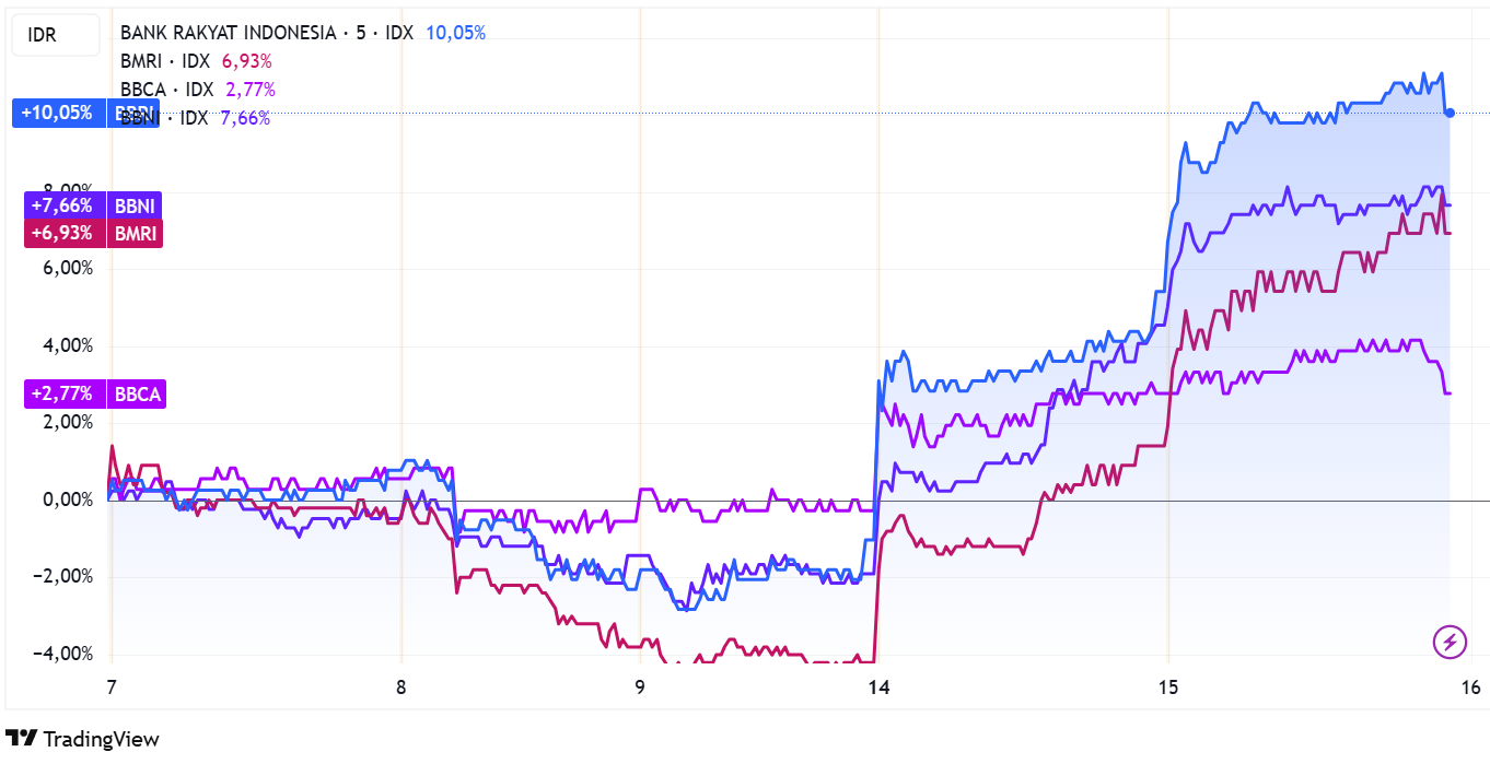 Sedangkan saham dengan penyumbang utama penguatan indeks hari ini datang dari saham big cap bank besar, seperti BBRI naik 4,40%, BMRI menguat 5,45%, dan BBNI naik 2,97%. Kenaikan juga didukung penguatan saham PANI, DSSA, dan CUAN.