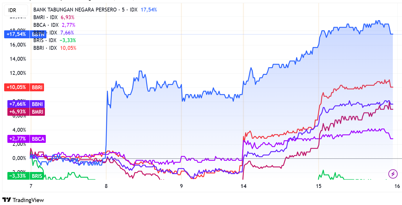 Berdasarkan data BEI, penguatan tertinggi dicatatkan saham PT Bank Mandiri Tbk (BMRI) sebanyak 11,64% menjadi Rp 5.325, PT Bank Rakyat Indonesia Tbk (BBRI) sebanyak 11,20% menjadi Rp 4.270, PT Bank Negara Indonesia Tbk (BBNI) sebanyak 9,76% menjadi Rp 4.500, PT Bank Tabungan Negara Tbk (BBTN) sebanyak 7,83% menjadi, PT Bank Syariah Indonesia Tbk (BRIS) sebanyak 4,32% menjadi Rp 2.900, dan PT Bank Central Asia Tbk (BBCA) sebanyak 3,06% menjadi Rp 9.275.