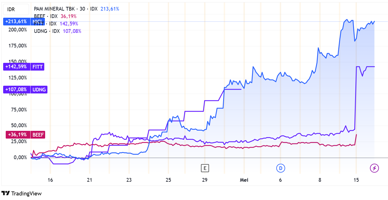 Data BEI menyebutkan bahwa saham UDNG telah melesat lebih adri 107% dalam sebulan. Begitu juga dengan saham BEEF telah melesat lebih dari 67% dalam kurun waktu yang sama.