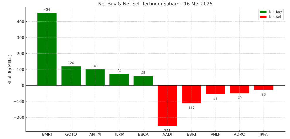 Net buy terbanyak hari ini kembali dicatatkan saham PT Bank Mandiri Tbk (BMRI) Rp 453,87 miliar, PT GoTo Gojek Tokopedia Tbk (GOTO) Rp 119,82 miliar, PT Aneka Tambang Tbk (ANTM) Rp 101,09 miliar, PT Telkom Indonesia Tbk (TLKM) Rp 73,35 miliar, dan PT Bank Central Asia Tbk (BBCA) Rp 58,81 miliar.