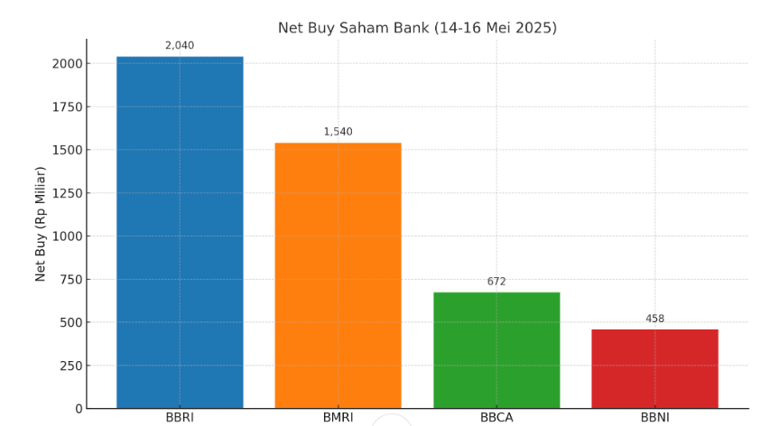 Berdasarkan data perdagangan saham Bursa Efek Indonesia (BEI) periode 14-16 Mei 2025, aliran dana asing terbesar masuk ke saham PT Bank Rakyat Indonesia Tbk (BBRI) bernilai Rp 2,04 triliun dan disusul PT Bank Mandiri Tbk (BMRI) Rp 1,54 triliun.