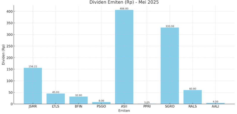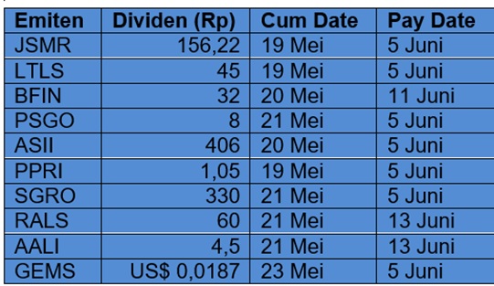 Emiten lainnya yang akan menggelar cumi dividen pekan ini, yaitu LSTLS dengan dividen Rp 45 per saham, BFIN dengan dividen Rp 32 per saham, PSGO dengan dividen Rp 8 per saham, PPRI dengan dividen Rp 1,05 per saham, AALI dengan dividen Rp 4,5 per saham, RALS dengan dividen Rp 60 per saham, dan GEMS dividen US$ 0,0187 per saham.