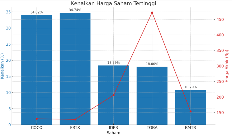 Meski tak ARA, tiga saham berikut catatkan lompatan harga mengensankan, yaitu saham PT Indonesia Pondasi Raya Tbk (IDPR) naik 18,39% menjadi Rp 206, PT TBS Energi Utama Tbk (TOBA) naik 18% menjadi Rp 472, dan PT Global Mediacom Tbk (BMTR) naik 10,79% menjadi Rp 154. Sebaliknya penurunan melanda saham DAYA, KOPI, NAIK, SINI, dan CTBN.
