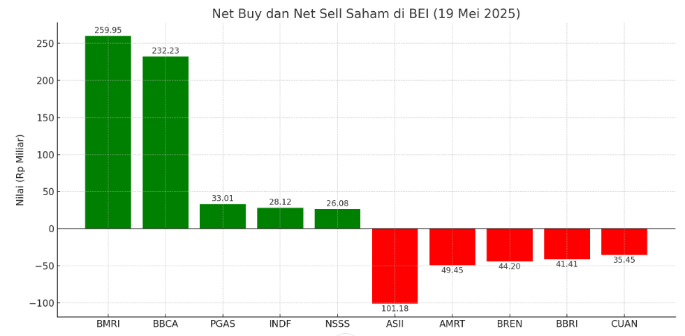 Net buy terbanyak kembali ditorehkan saham bank, yaitu PT Bank Mandiri Tbk (BMRI) Rp 259,95 miliar dan PT Bank Central Asia Tbk (BBCA) Rp 232,23 miliar. Selanjutnya PT Perusahaan Gas Negara Tbk (PGAS) Rp 33,01 miliar, PT Indofood Sukses Makmur Tbk (INDF) Rp 28,12 miliar, dan PT Nusantara Sawit Sejahtera Tbk (NSSS) Rp 26,08 miliar.