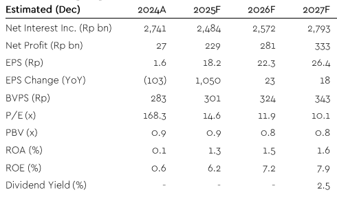 Didukung perbaikan kualitas kredit dan pertumbuhan pesat laba bersih kuartal I-2025, Sucor Sekuritas memilih untuk merevisi naik target laba bersih BBYB tahun ini. Laba bersih tahun ini direvisi naik menjadi Rp 229 miliar dan menjadi Rp 281 miliar tahun 2026. “Kami menilai BBYB akan mempertahankan peningkatan laba yang stabil ke depan didukung perbaikan kualitas aset dan perbaikan margin keuntungan,” terangnya.