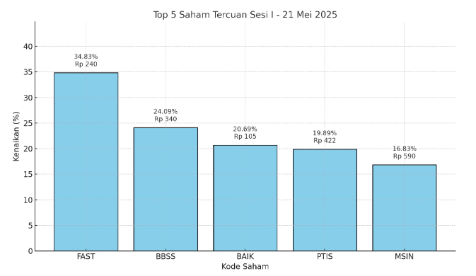 Sedangkan saham dengan penguatan tertingi dicatatkan PT Fast Food Indonesia Tbk (FAST) sebanyak 34,83% menjadi Rp 240, PT Bumi Benowo Sukses Sejahtera Tbk (BBSS) naik 24,09% menjadi Rp 340, PT Bersama Mencapai Puncak Tbk (BAIK) naik 20,69% menjadi Rp 105, PT Indo Straits Tbk (PTIS) menguat 19,89% menjadi Rp 422, dan PT MNC Digital Entertainment Tbk (MSIN) sebanyak 16,83% menjadi Rp 590.
