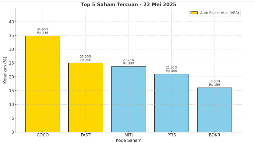 Meski tak ARA, kenaikan pesat juga melanda saham PT Mitra Investindo Tbk (MITI) 23,75% menjadi Rp 198, PT Indo Straits Tbk (PTIS) naik 21,05% menjadi Rp 460, dan PT Berdikari Pondasi Perkasa Tbk (BDKR) naik 16,06% menjadi Rp 159. Kondisi berbeda dicatatkan saham KOPI, SGRO, RALS, HAJJ, dan LAJU.